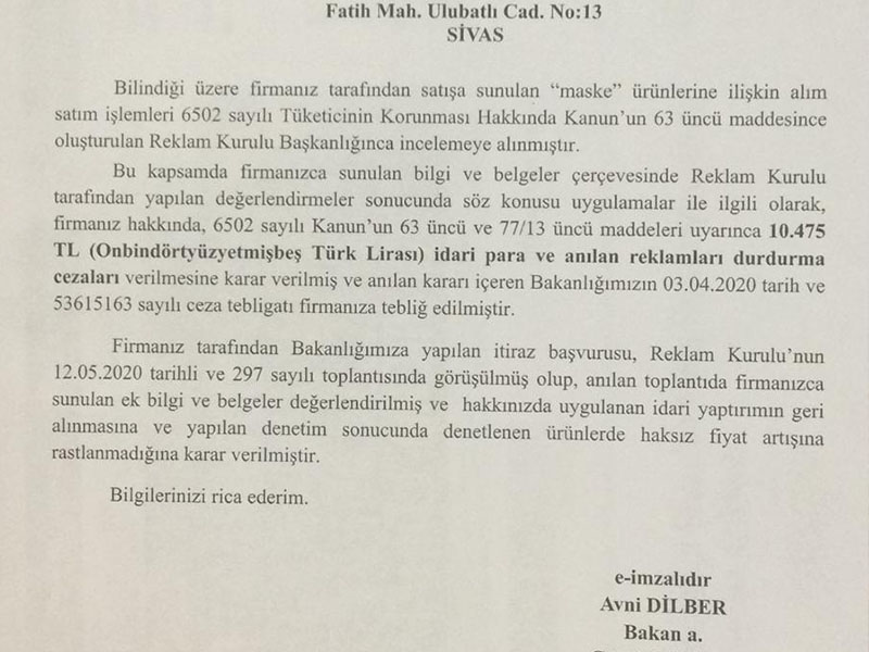 Korona virüse tüm dünya olduğu gibi Sivas’ta hazırlıksız yakalandı. Kovid-19’un ortaya çıktığı ilk günlerde maske ve dezenfektana olan talep fiyat artışlarına neden olmuştu. İşletmelere yapılan denetimlerde kurallara uymayarak, fahiş fiyattan maske satanlara ceza kesmişti. Ticaret Bakanlığı Sivas’ta faaliyet gösteren Öz Işık Eczanesi’ne de kestiği idari para cezasını geri çekti. Tüketicinin Korunması ve Piyasa Gözetimi Genel Müdürlüğü yaptığı incelemede, Öz Işık Eczanesinin fahiş fiyat uygulamadığına karar verdi.