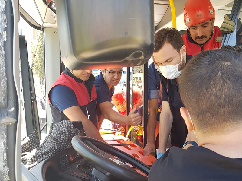 Otobüste sıkışan sürücüyü itfaiye ekiple ...